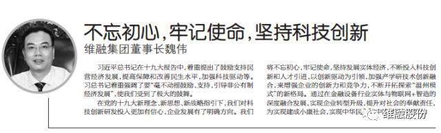 據(jù)悉,近日維融集團董事長兼維融股份公司總經(jīng)理魏偉在接受溫州商報就“企業(yè)家讀十九大報告”采訪時,提出以“不忘初心,牢記使命,堅持科技創(chuàng)新”為核心的十九大報告體會。