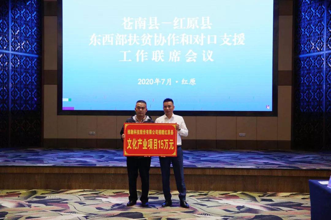 會(huì)議上,舉行了結(jié)對(duì)幫扶協(xié)議簽訂和資金受授儀式,蒼南縣慈善總會(huì)、維融科技單位等對(duì)口支援與紅原縣文旅局。維融科技捐贈(zèng)紅原縣文化產(chǎn)業(yè)項(xiàng)目15萬元,以助力紅原縣文化產(chǎn)業(yè)項(xiàng)目的開展和落實(shí)。